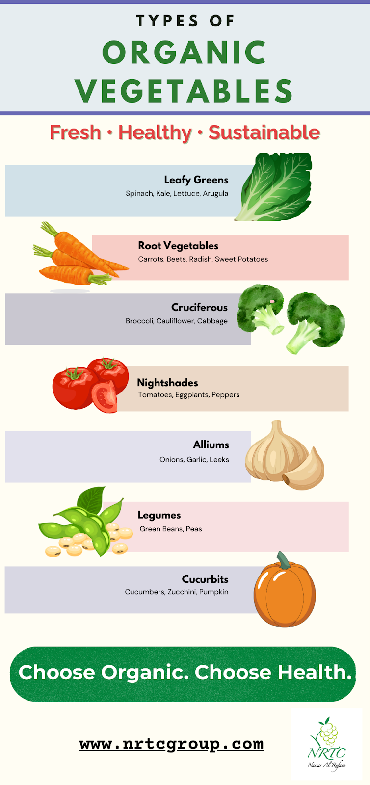Organic vegetables exist in a variety of shapes, sizes, and forms. Some of the most common types/categories are: